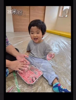 小麦粉絵の具🎨、寒天、カラフルマカロニで遊びました😚